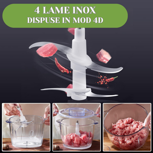 Tocator electric pentru carne si legume, 4 lame inox, 2 viteze, bol sticla